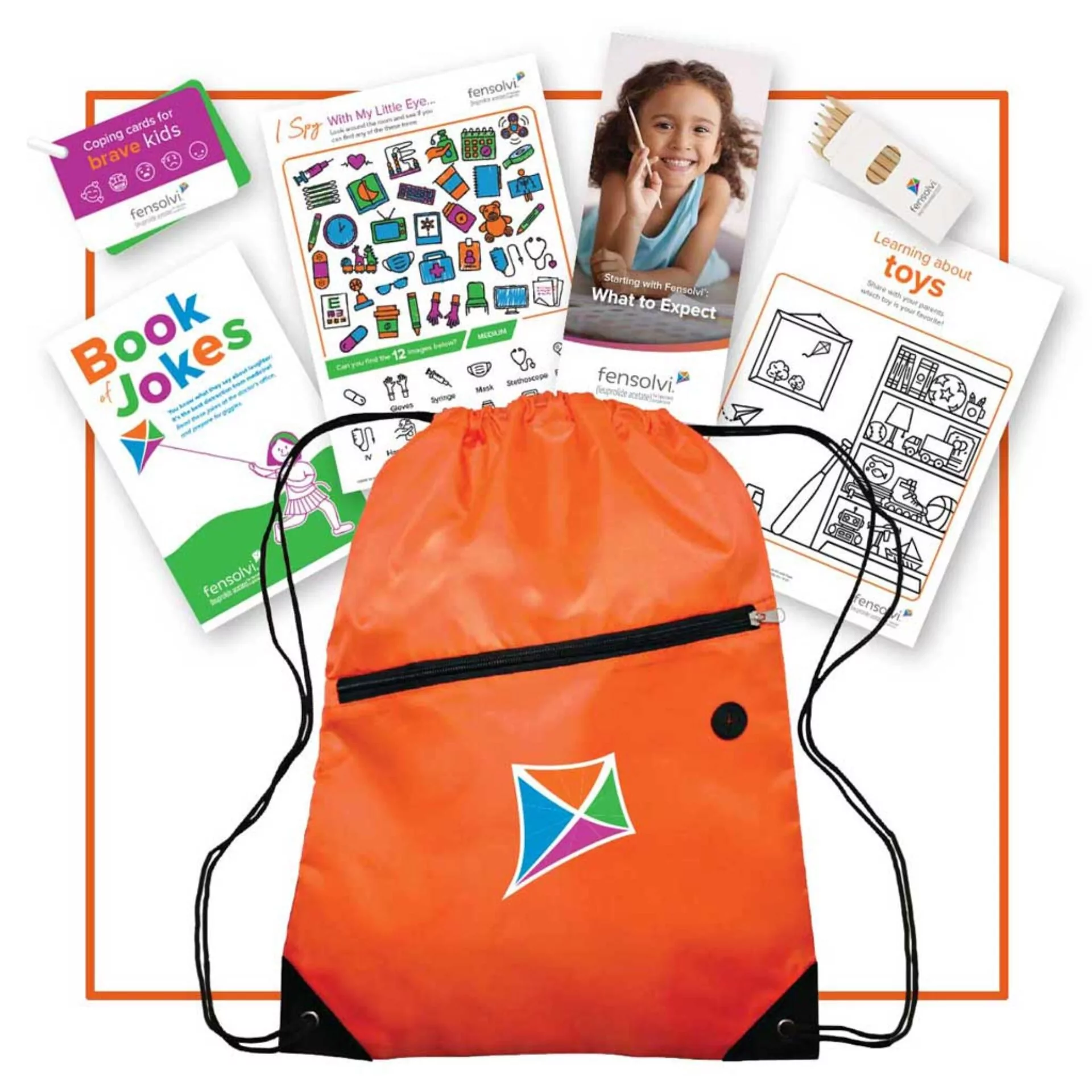 We’re excited to offer Fensolvi starter kits for new patients who have been prescribed Fensolvi. Each kit contains helpful information for caregivers, along with engaging activities for children to make each treatment visit a little more fun. Contents include a treatment brochure, coloring and iSpy sheets, coloring pencils, a book of jokes, and coping cards—all inside a handy drawstring bag.